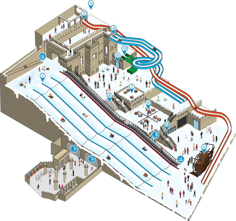 Inside Snow Dunes, every corner offers something new to enjoy. Children and families love the playful energy of Snow Slide, Snow Motion, and Snowy Mount, while older guests are drawn to the speed and excitement of Snow Storm and Dune Dash.